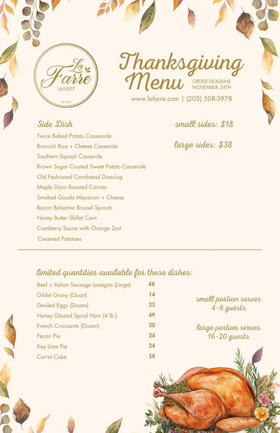 Regular price $0.00Eat, Drink and Be Thankful! Let us make your Thanksgiving gathering less stressful for you. We encourage orders to be placed in advance and not last minute if possible.